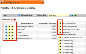 - mithilfe dieser Schaltfläche können Sie den Datensatz bearbeiten und den Schwellenwert Warnung (in %) für diesen Arbeitsbereich definieren. Ein Beispiel: für den Arbeitsbereich 'Entwurf' wurden 100 Stunden geplant und der Schwellenwert von 50% definiert. Dies bedeutet dass bei 50 gebuchten Stunden der Schwellenwert erreicht wurde und eine Warnung angezeigt wird.