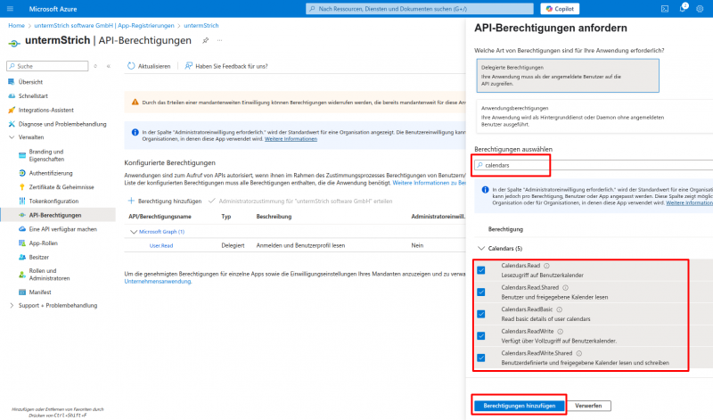 Über den Menüpunkt „API-Berechtigungen“ definieren Sie nun welche Berechtigungen ihre App erhalten soll. Füge Sie neue Berechtigungen hinzu und wählen Sie „Microsoft Graph“