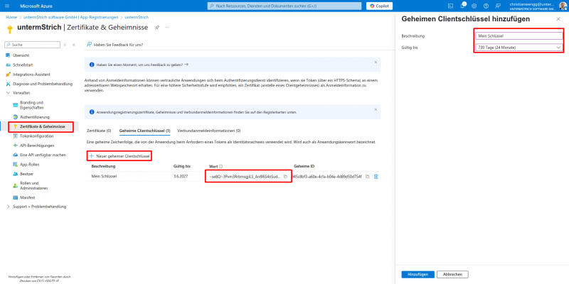 Wechseln Sie in das Menü „Zertifikate & Geheimnisse“ und erstellen Sie einen neuen geheimen Clientschlüssel. Vergeben Sie ein Beschreibung und eine Gültigkeit. Der Schlüssel kann maximal 24 Monate gültig bleiben. Danach muss ein Neuer erstellt werden und dieser dann auch in untermStrich aktualisiert werden. Wenn der Schlüssel erstellt worden ist notieren Sie sich den „Wert“ des Schlüssels. Sie werden diesen später benötigen.