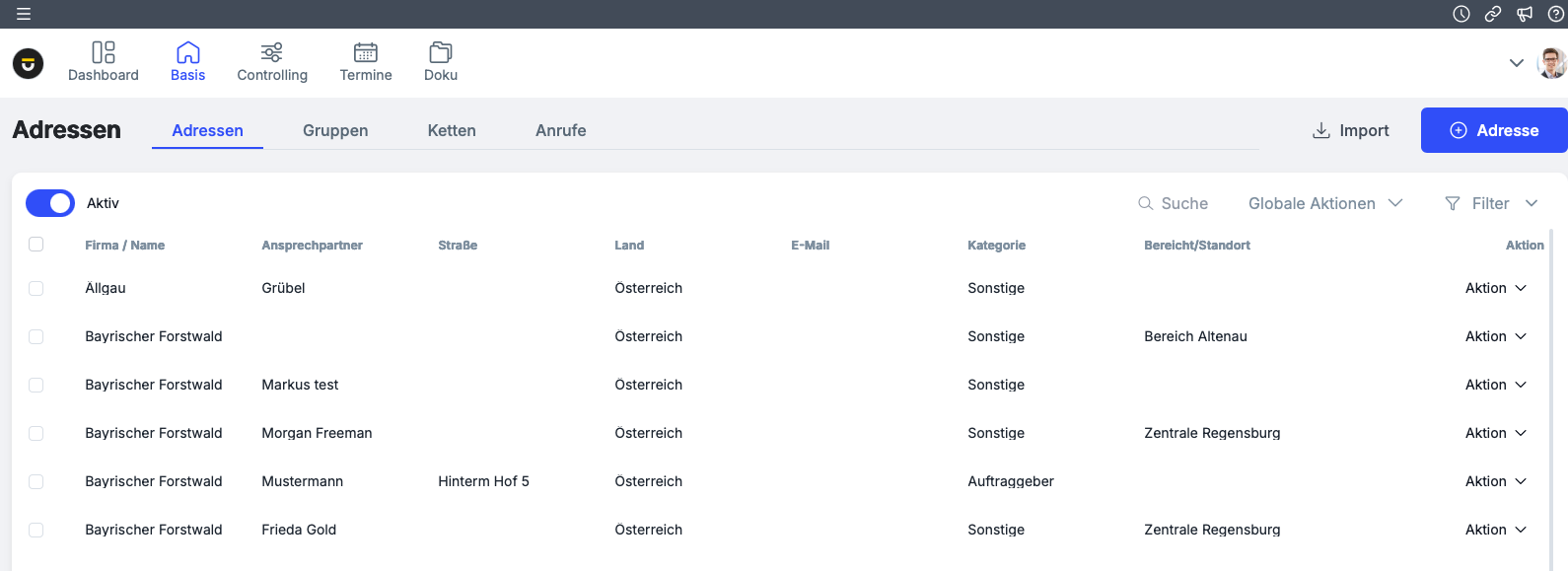 Alle Adressdaten sind systemweit verfügbar und müssen nur einmal erfasst werden. Änderungen werden automatisch in allen verknüpften Datensätzen übernommen, was die Pflege deutlich vereinfacht.