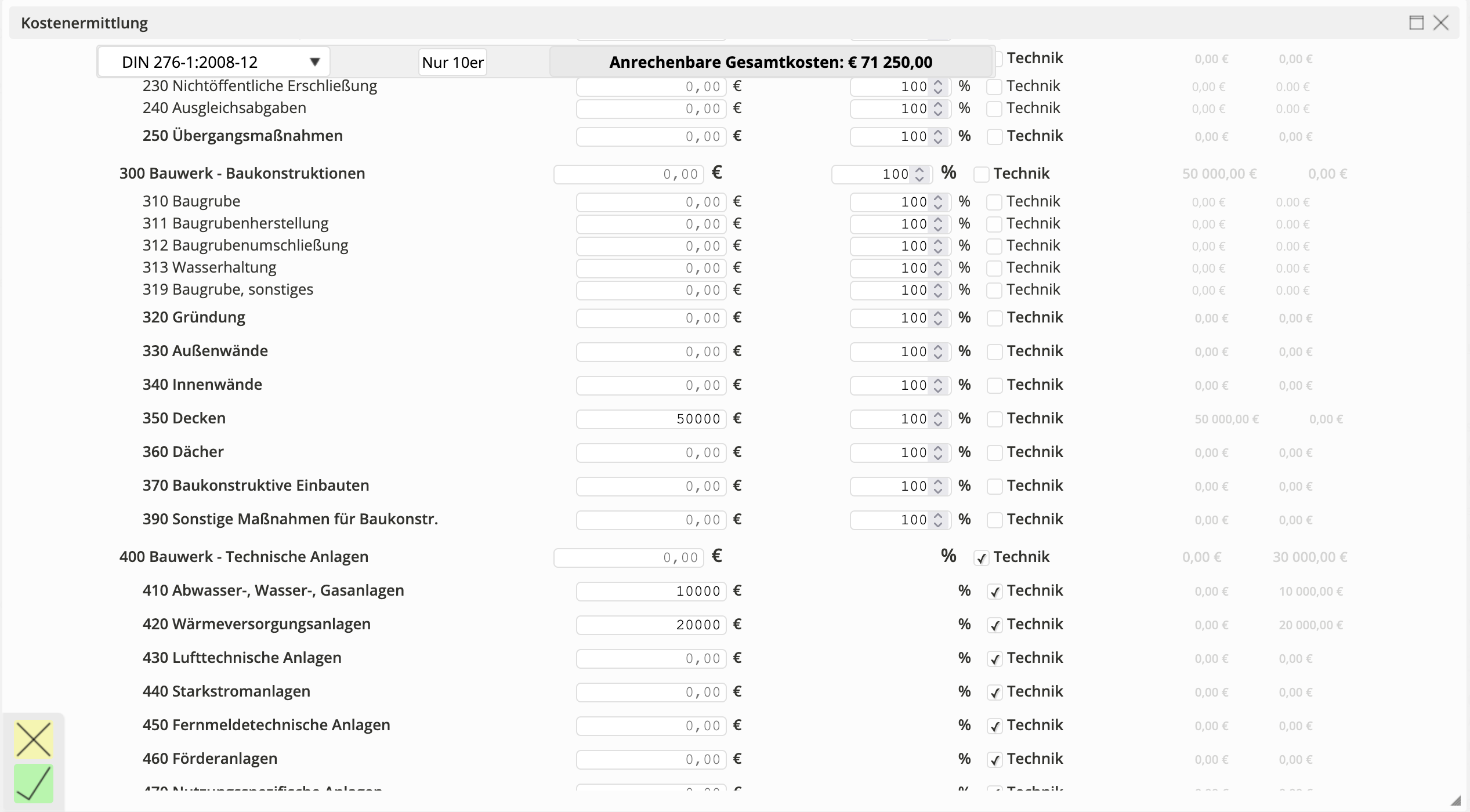 Geben Sie die Kosten je gewünschter Kostengruppe/gliederung an und legen sie dessen Anrechenbarkeit fest.