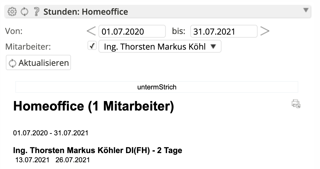 Per E-Mail sendenDrucken × Widgets Stunden: Homeoffice Zeigt die Anzahl der Homeoffice-Tage und die Tage in einem definierten Zeitraum an. Details zu Homeoffice. Anmelden