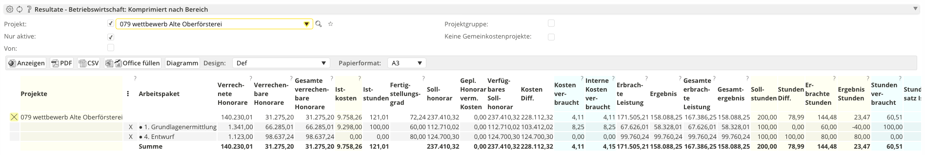 Honorar: ist die Summe aus der Registerkarte Honorarzuordnung in dem Modul Projekte.