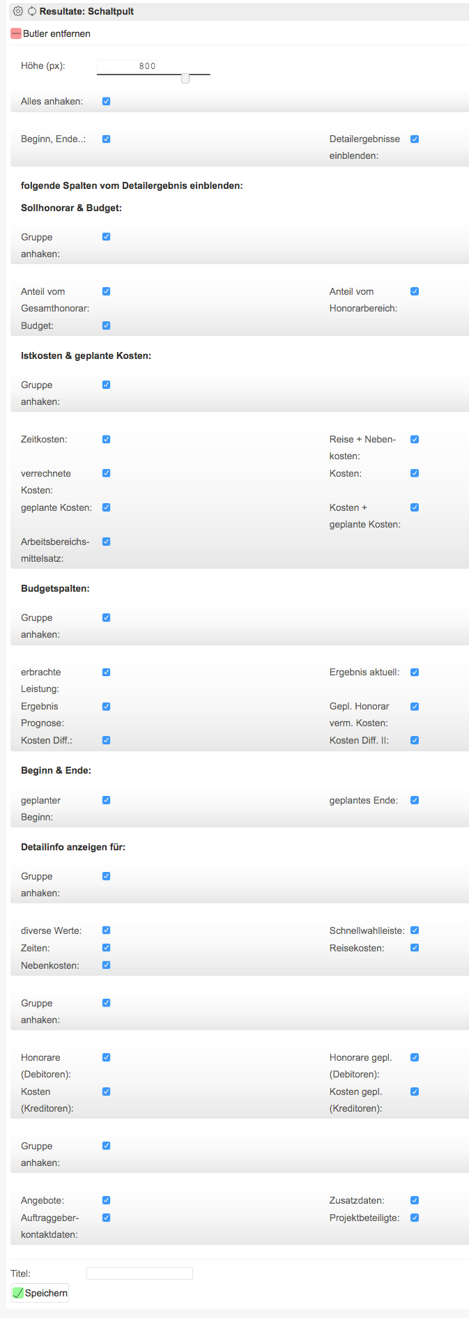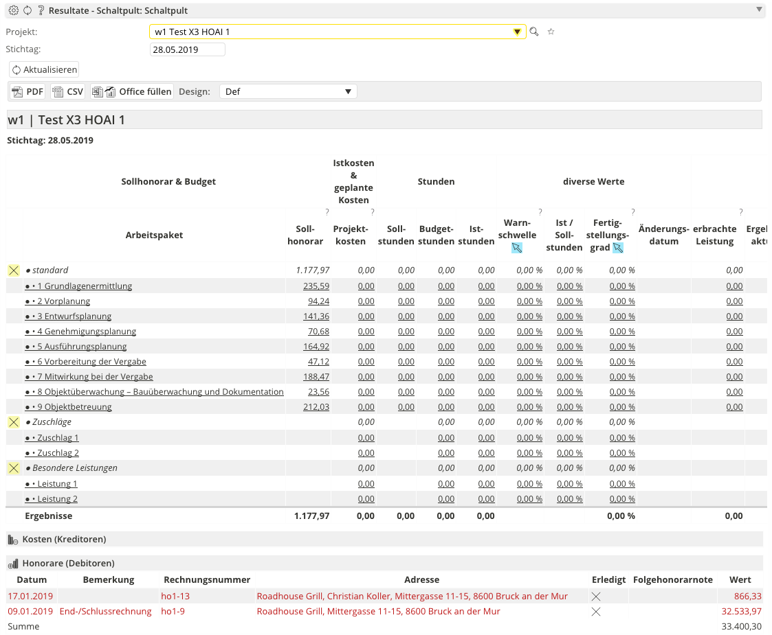 - Neben allen möglichen Werten bietet ihnen das Schaltpult Projektergebnisse auf Honorar- und Budgetbasis.