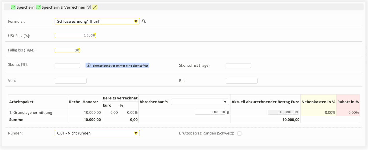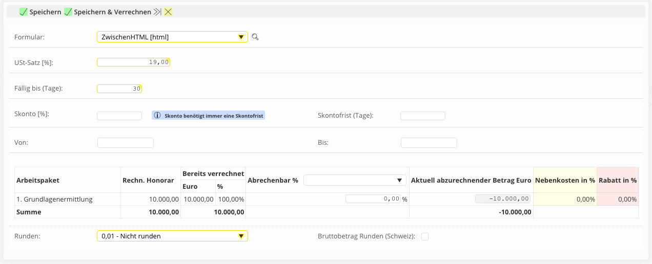 In diesem Beispiel gehen wir davon aus, dass Sie bereits Zwischenrechnungen/Abschlagszahlungen mit einem anderen Mehrwertsteuersatz (19%) erstellt haben.