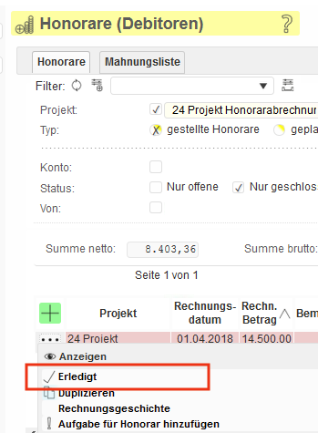 - Wechseln Sie zum Modul Honorare und setzen Sie die Honorarnote als erledigt
