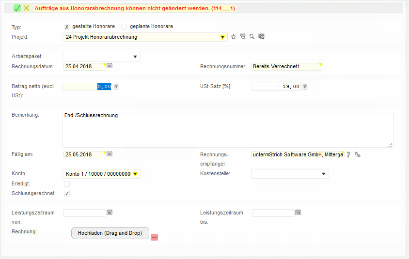 - Geben Sie im Feld Rechnungsnummer einen Vermerk ein (z.B. „bereits verrechnet“) damit keine neue Nummer generiert wird.