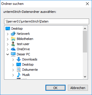 Im oberen Bereich können Sie direkt den Pfad zum Datenordner eingeben. Tragen Sie hier einen UNC-Pfad (also kein gemapptes Netzlaufwerk) ein. Bestätigen Sie anschließend die Pfadangabe mit der Schaltfläche OK.
