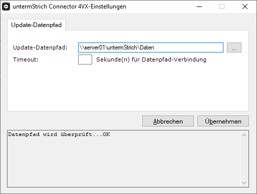 Wenn der untermStrich Connector 4VX mittels VPN auf den Datenordner zugreifen soll kann es vorkommen, dass der Zugriff (nach dem Anmelden in der untermStrich-Software) nicht sofort verfügbar ist. In diesem Fall wird das Dialogfenster für die Datenpfad-Auswahl angezeigt. Sie können dies verhindern, indem Sie den Wert für Timeout erhöhen.