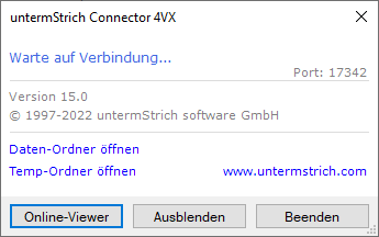 Im oberen Bereich wird angezeigt, ob der Connector mit der untermStrich-Software verbunden ist. Nur wenn der Connector 4VX aktiv ist, können die Connector-Funktionalitäten verwendet werden.