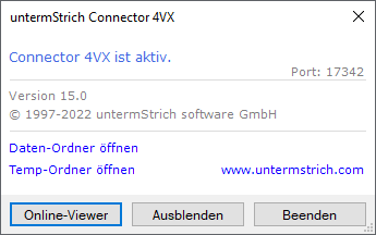 Um festzustellen, welche Version des Connectors installiert ist, wird diese hier angezeigt. Sie sollten den untermStrich Connector 4VX regelmäßig auf Aktualisierungen überprüfen. Informationen zum Connector-Update: http://kunden.untermstrich.com/version-14.html