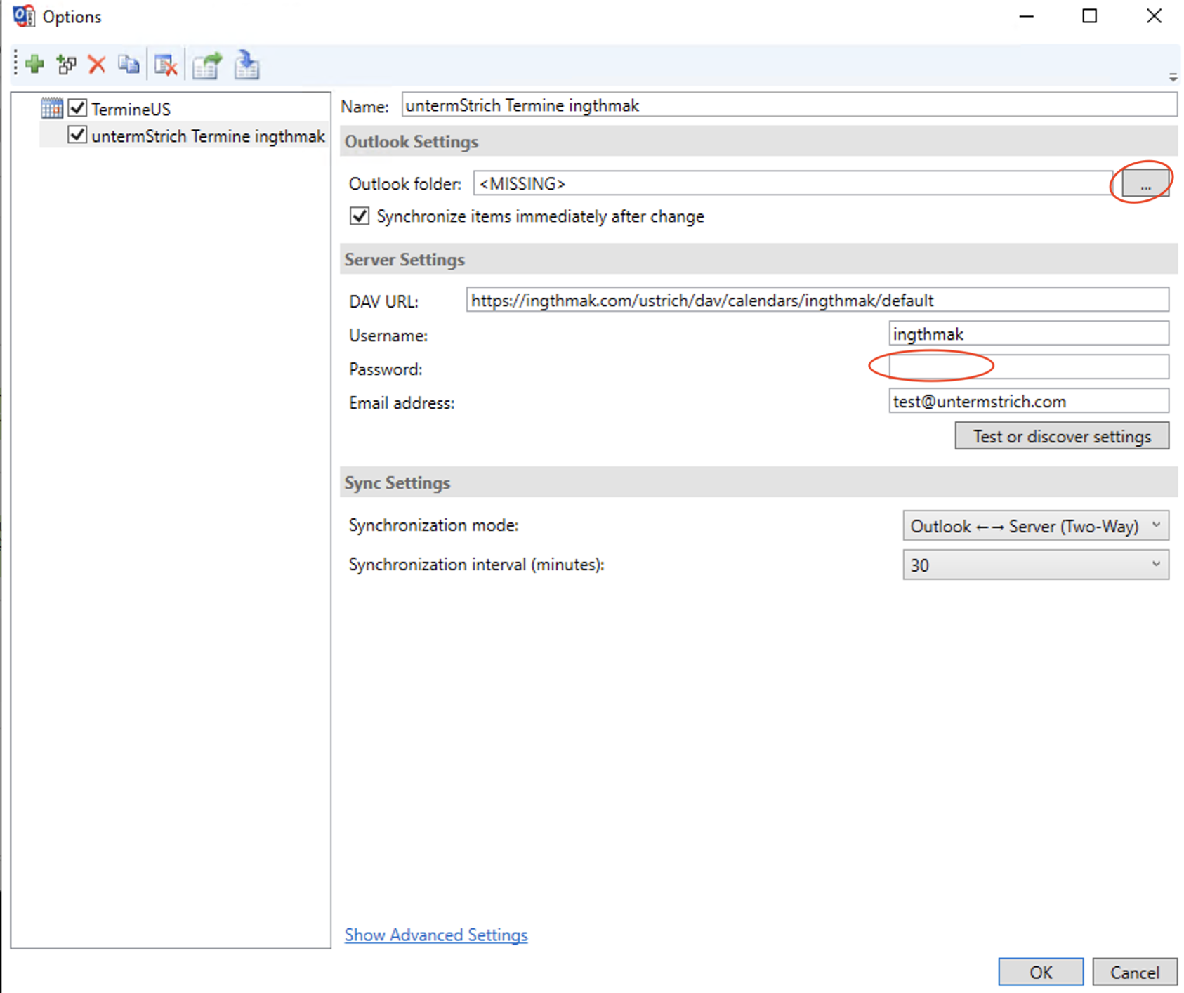 - Der Outlook Folder muss zwingend leer sein, da ansonsten alle vorhandenen Einträge mit untermStrich synchronisiert werden. Dies gilt auch, wenn Sie nur die URL ändern. Ansonsten haben Sie danach doppelte Einträge!