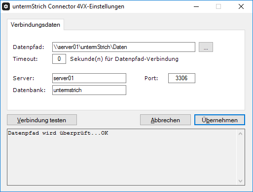 Sie können, falls erforderlich, den Datenpfad mit dem Programm untermStrich Connector 4VX-Einstellungen ändern. Dieses befindet sich im Programmordner des Connectors (meist C:\Programme (x86)\untermStrich). Führen Sie die Datei settings.exe aus. Es öffnet sich folgendes Fenster, in dem Sie den Datenpfad ändern können: