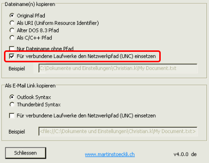 Per E-Mail sendenDrucken × IT - FAQ Browser Connector (4VX) E-Mail MySQL Server E-Rechnung Weitere Themen Inhaltsverzeichnis CopyPathMenu Empfohlene Konfiguration Verwendung CopyPathMenu Eine Erweiterung des Windows Explorer, die es erlaubt, den vollständigen Pfad einer Datei oder eines Verzeichnis, zu kopieren Download auf heise.de Empfohlene Konfiguration Öffnen Sie die Konfiguration Aktivieren Sie UNC einsetzen Verwendung Kopieren Sie den Pfad → Rechte Maustaste Inhalt der Zwischenablage: Anmelden