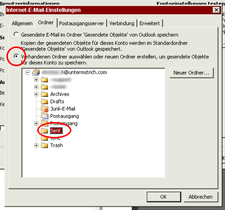 - Aktivieren Sie die Option „Vorhandenen Ordner auswählen…“ bzw „Gesendete Elemente im folgenden Ordner auf dem Server speichern“ und wählen Sie den Ordner. Typischerweise „Sent“.