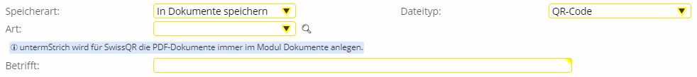 - der Dateityp der SwissQR Rechnung. Hier kann zwischen vier verschiedenen Arten gewählt werden. „QR-Code“ erstellt hierbei eine BILD Datei, welche nur den QR-Code der Rechnung beinhaltet. „PDF-Datei“ erstellt eine leere PDF Datei, welche den QR-Code plus zusätzlicher Informationen erstellt. „QR-Code in Formularart“ verwendet die Formularart, welche beim Feld „Art“ angegeben wird und fügt in die Dokumentenvariable „EXTRA_BILD“ den QR-Code ein. „PDF-Abschnitt in Formularart“ verwendet die Formularart, welche im Feld „Art“ angegeben wird und fügt den QR-Code plus zusätzlicher Informationen an das Ende des Formularartes/Dokumentes an und wandelt das Dokument in eine PDF Datei.