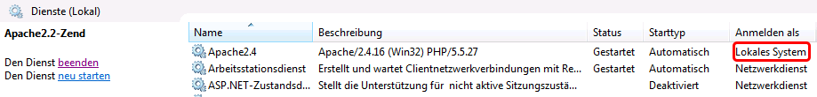 Wenn Sie unter Schritt 1 einen anderen Benutzer aufgezeichnet haben, stellen Sie die Anmeldung des Apache Dienstes auf diesen Benutzer um.