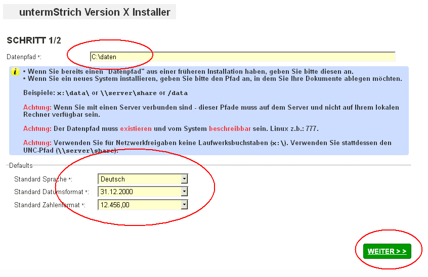 Für eine Updateinstallation geben Sie bitte Ihr bestehendes untermStrich Datenverzeichnis an.