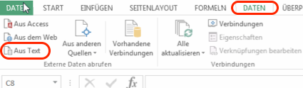 - Dann wählen Sie „Daten“ und „Aus Text“ und wählen die exportierte CSV Datei aus: