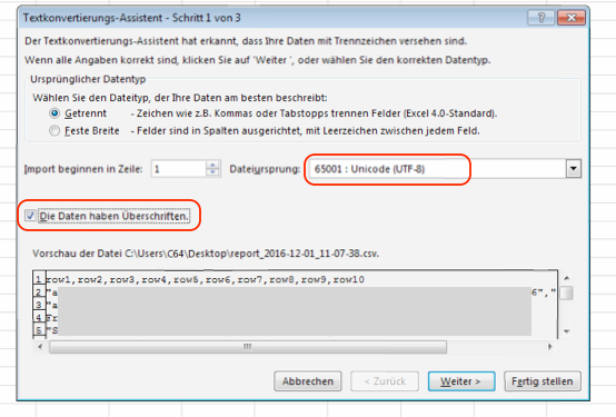 - Wählen Sie das Format „UTF-8“ und wenn vorhanden „Die Daten haben Überschriften“: