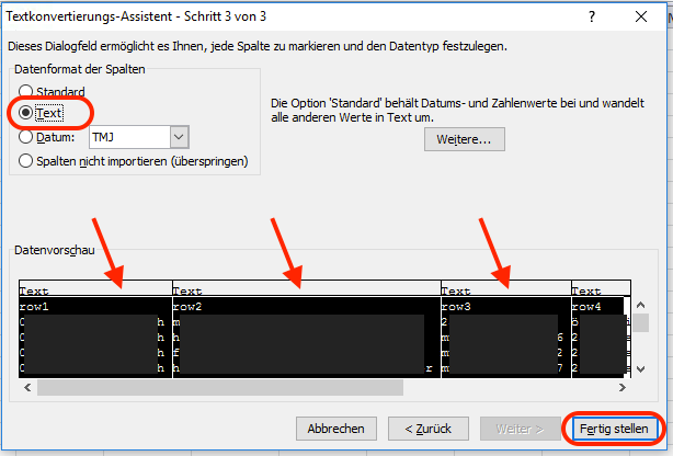 - Sollten Sie Daten haben, die mit „+“ beginnen, stellen Sie auf Seite 3 die Zellen noch auf das Datenformat „Text“ um: