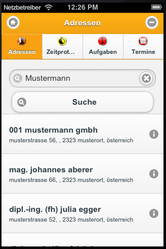 Um eine Adresse in der Adressdatenbank zu finden, geben Sie im Feld Adresse eine Zeichenfolge nach der in der Adressdatenbank gesucht werden soll ein und tippen Sie dann auf die Schaltfläche Suche. Anschließend wird eine Adressliste mit den Ergebnissen der Suche angezeigt.