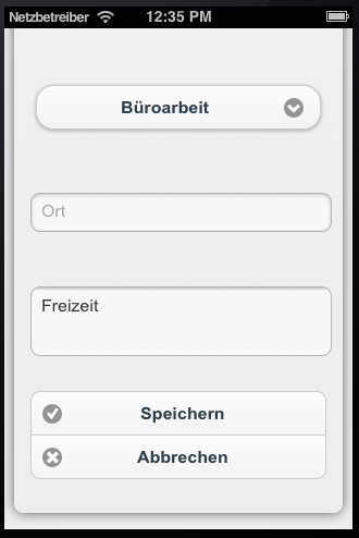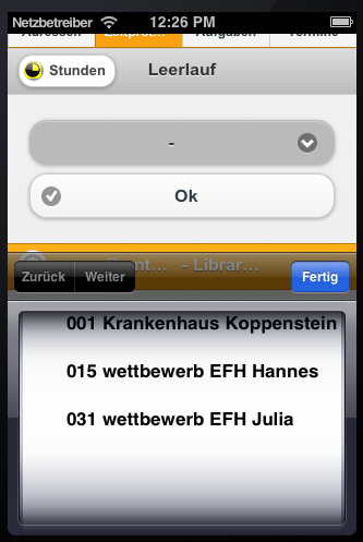 Wollen Sie die Protokollierung stoppen, tippen Sie auf den leeren Eintrag in der Projektliste. Die Uhr wird angehalten, und „… Leerlauf …“ erscheint in der Titelleiste.