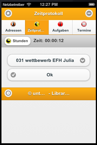Um die Zeitprotokollierung für ein Projekt zu starten, wählen Sie zuerst das gewünschte Projekt aus der Auswahlliste und tippen Sie anschließend auf Ok.