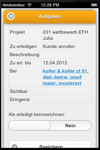 Geben Sie eine kurze Beschreibung und eventuell eine Rückmeldung an Aufgabengeber ein. Tippen Sie anschließend auf SPEICHERN.