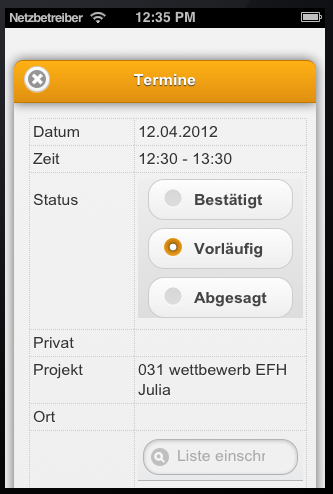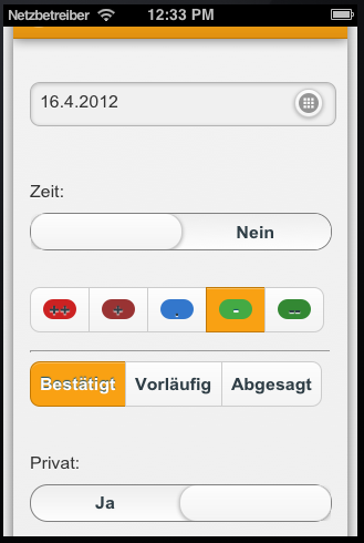 Die Termine können farbig markiert werden. Tippen Sie auf die gewünschte Farbe. Legen Sie den Status eines Termins fest (bestätigt, vorläufig, abgesagt).