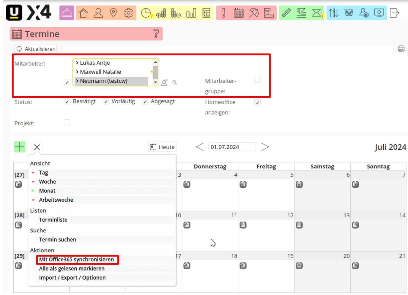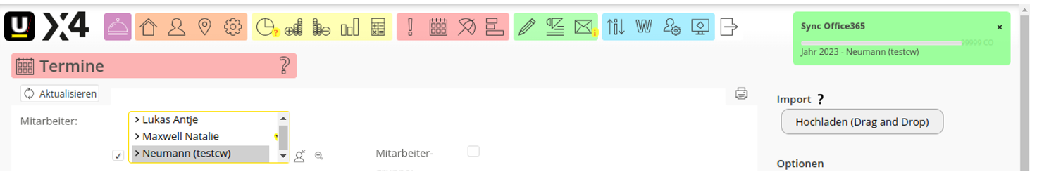 Die manuelle Synchronisation kann über das Burgermenü angestoßen werden. Dabei wird der Mitarbeiter(gruppen) Filter berücksichtigt und die Kalender für die ausgewählten Mitarbeiter aktualisiert. Bei der Aktualisierung werden nur Termine im aktuellen, sowie im vorherigen und darauffolgenden Kalenderjahr berücksichtigt. Auch beim Erstimport werden nur Termine aus diesen 3 Jahren berücksichtigt.