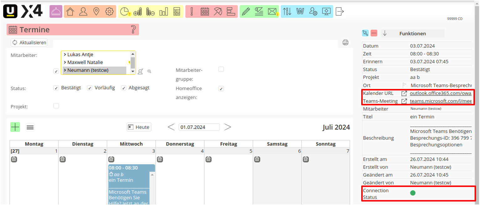 - Die Kalender URL verlinkt auf den Microsoft 365 Kalender-Eintrag.