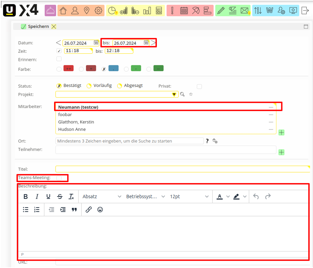 So ist es jetzt möglich, Termine mit einem Bis Datum zu versehen. Ein einzelner Termin kann damit jetzt auch über die Tagesgrenze hinweg erstellt werden. Bei der Auswahl der Mitarbeiter ist nun die Reihenfolge relevant. Der erste Mitarbeiter (fett gedruckt) ist der, der Organisator des Termins. Der Termin wird immer mit dem Microsoft 365 Account dieses untermStrich Users erstellt. Die anderen Mitarbeiter bekommen von ihm eine Termineinladung in Microsoft 365. Das bedeutet auch, dass Mitarbeiter (so wie in Microsoft 365 auch) Termine, die von anderen organisiert werden, nicht verändern können. Um einen Termin als Organisator erstellen, muss er einloggte Mitarbeiter entweder selbst der Organisator sein (also in der Liste ganz oben fett gedruckt sein), oder in Microsoft 365 die Berechtigung erhalten haben für den Organisator Termine zu erstellen. 4) Weiters gibt es den Haken, Teams-Meeting. Wenn dieser aktiviert wird, wird automatisch ein Teams-Meeting erstellt. Das Feld Beschreibung wurde erweitert, damit wie es in Microsoft 365 auch möglich ist, HTML zu nutzen, und damit einige Formatierungen vorzunehmen.