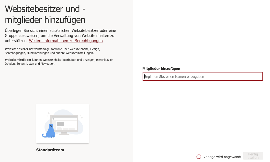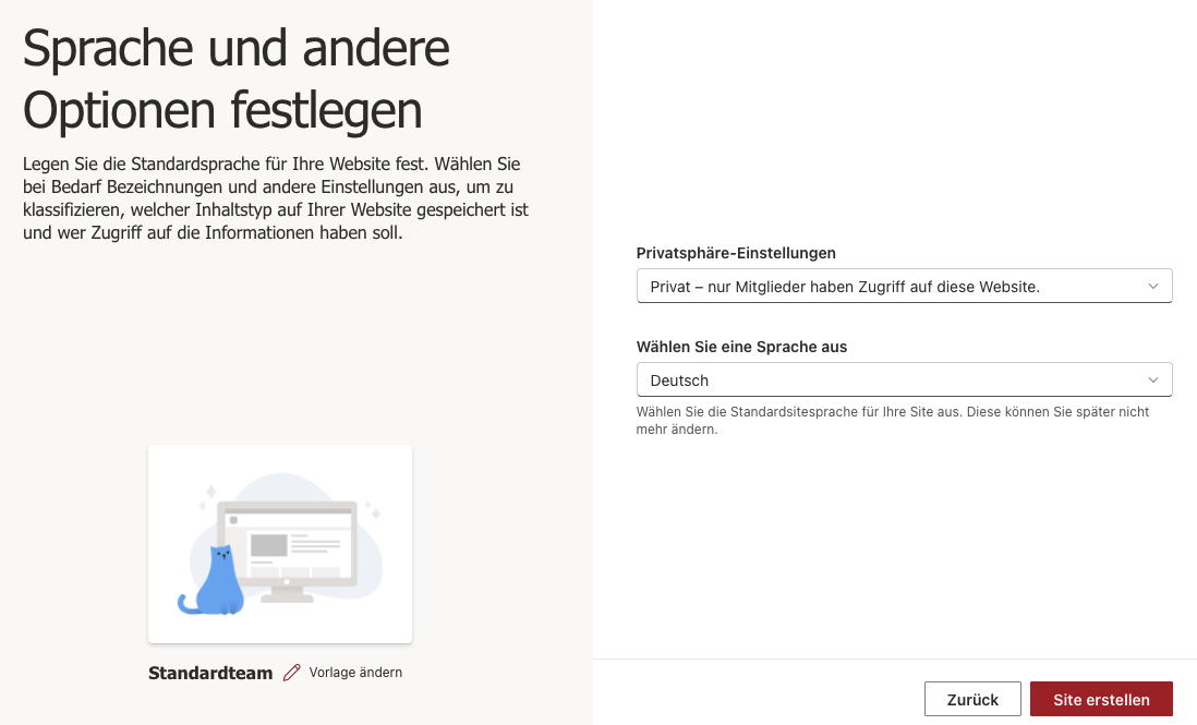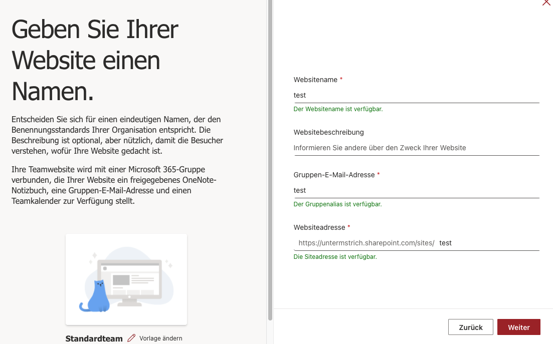- Wählen Sie „Teamwebsite“ und vergeben einen Namen für die Website (optional auch eine Beschreibung hinzufügen)