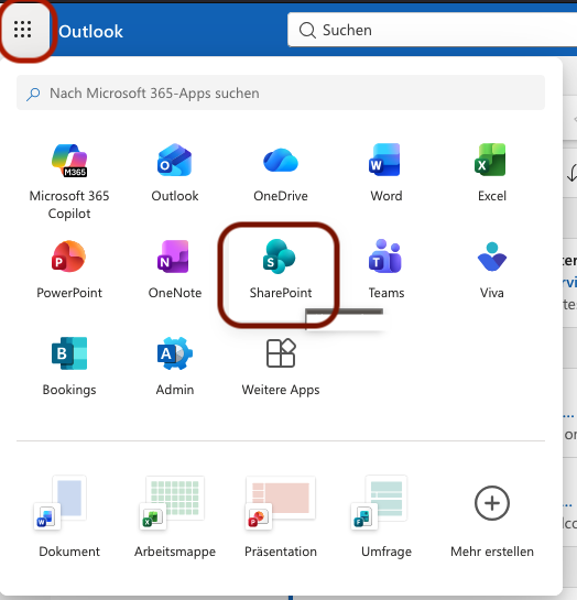 - Öffnen Sie SharePoint Microsoft 365 Login Über den App-Launcher (9-Punkte-Menü) oben links navigieren Sie zur App „Share-Point“