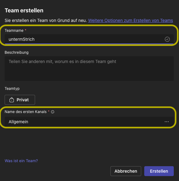 - Wählen Sie Teamtyp, Teamname und Name des Kanals und klicken auf „Erstellen“
