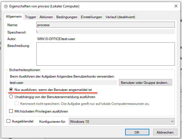 - Wählen Sie am Tab „Allgemein „Nur ausführen, wenn der Benuzter angemeldet ist“