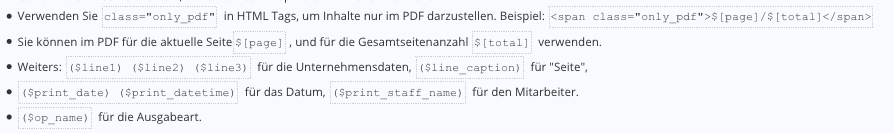 Die verfügbaren Felder (z.B. Seite, Unternehmensdaten, Datum, …) sind in der Software beschrieben.