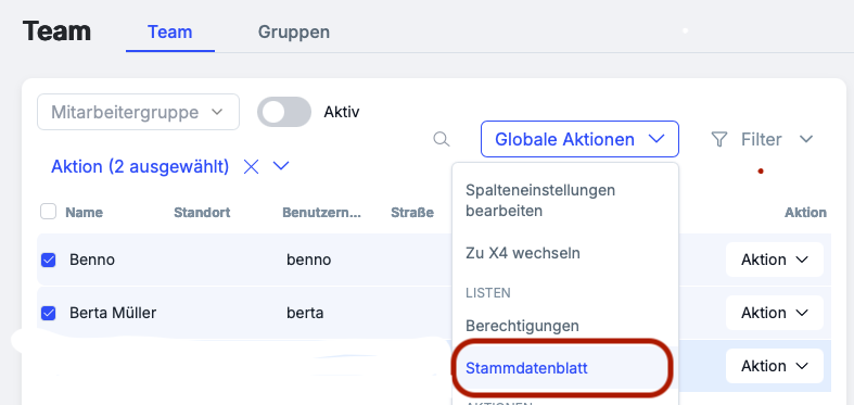 Markieren Sie eine oder mehrere MitarbeiterInnen und klicken auf Stammdatenblatt.