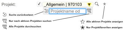 Fahren Sie mit der Maus einfach auf die Auswahlliste und die Projektsuche wird angezeigt. Sie können dann sofort nach einem Projekt suchen. Wenn Sie direkt auf ein Projekt einschränken, wird diese sofort vorausgewählt, ansonsten wählen Sie in der Liste das gewünschte Projekt.